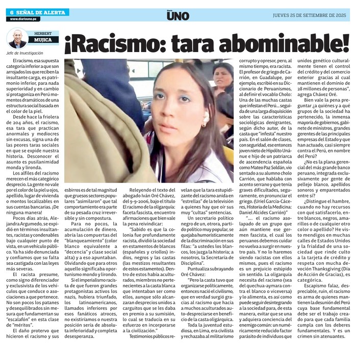 “…. el racismo asolapado de un grupo que aún mantiene ese germen fascista, el cual los peruanos debemos cuidar no vuelva a surgir en nuestro país. Y no lo haremos siendo racistas con ellos mismos, pues el racismo es un prejuicio estúpido sin sentido. La oligarquía necesita del racismo (sea del quechua-aymara contra el blanco o viceversa) y lo alimenta, es así como puede seguir desintegrando a la sociedad para, de esta manera, evitar que se una y adquiera conciencia del enemigo común: un numéricamente reducido factor parásito de individuos que unidos genético culturalmente tienen el control del crédito y del comercio exterior gracias al cual mantienen el dominio de 28 millones de personas”, agrega Chávez Oré.