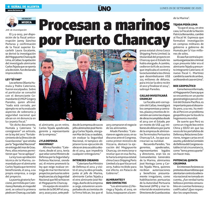 El 3-9-2025. por disposición de la fiscal anticorrupción Janny Sánchez Porturas y confirmación de la fiscal superior Escarleth Laura Escalante, se derivó la investigación del Megapuerto Chancay de Lima, al Callao; la apelación del investigado almirante Carlos Tejada que se oponía a la decisión, fue declarada improcedente.