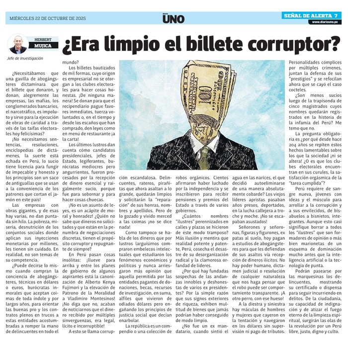 Podrán pasearse por las marquesinas los delincuentes, mostrando su certificado o dispensa para seguir incurriendo en delitos. De la ciudadanía, su capacidad de indignación y de atizar el fuego eterno de la limpieza espiritual, surgirán las olas de la revolución por un Perú libre, justo, digno y culto.